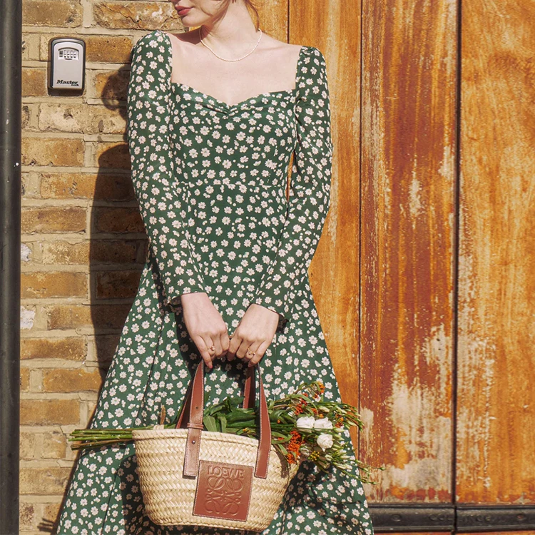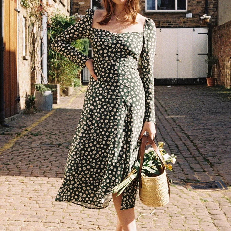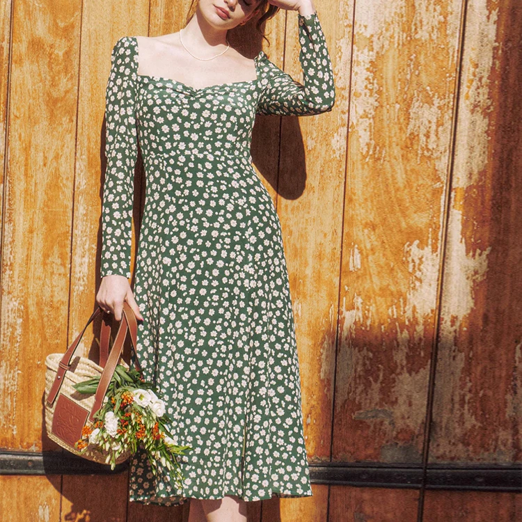 HL Factory 2023 New Arrival Designer Green Dress Women Custom Spring Long Sleeve Dresses Wholesale Summer Split Floral Dress